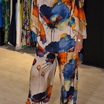 - Conjunto de Duas Peças: Inclui uma blusa fluida e calças largas combinando, oferecendo um visual coordenado e estiloso.