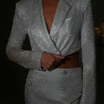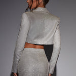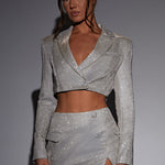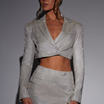 Diga olá ao terno luxuoso dos seus sonhos. Feita em nosso tecido brilhante, Stefania faz parte da nossa nova linha de alfaiataria premium, apresentando um corte cropped, ajuste regular com colarinho e fechamento frontal com botão. Combine com a saia Stefania para uma perfeição de alfaiataria brilhante.