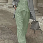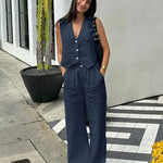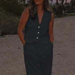 Elegância Atemporal: Este conjunto de duas peças, composto por um colete elegante sem mangas e uma calça ampla, exala sofisticação sem esforço. Seja no brunch durante o dia ou em um evento noturno – graças à sua estética refinada, você sempre parecerá elegante e chique.