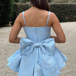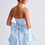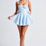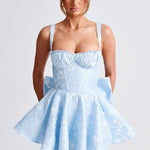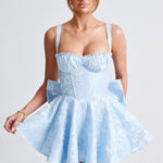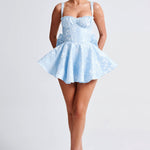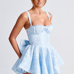 Nos dê todos os macacões bonitos nesta temporada! Emelie é feito de um tecido jacquard premium com um design floral por toda parte, ajustando na cintura e abrindo suavemente na saia, que possui shorts embutidos. Com um busto balconete com aro e detalhe em renda, o look é completado com um laço oversized dramático nas costas que você pode remover.