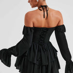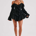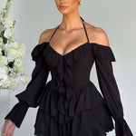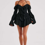 Se apaixone pelo macacão Savanna, nosso design super feminino e cheio de babados com estilo off the shoulder e um fino laço no pescoço. Com um decote profundo e mangas longas e esvoaçantes, a saia apresenta camadas de babados que balançam quando você se move. Use o seu com elegantes mules e uma mini bolsa.
