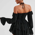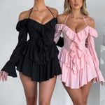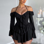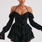Apaixone-se pelo macacão Savanna, nosso design super feminino e cheio de babados, com estilo off the shoulder e um fino laço no pescoço. Com um decote profundo e mangas longas e leves, a saia apresenta camadas de babados que balançam quando você se move. Use o seu com elegantes mules e uma bolsa mini.