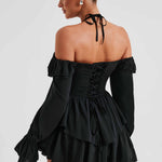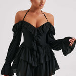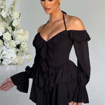 Se apaixone pelo macacão Savanna, nosso design super feminino e cheio de babados, com estilo off the shoulder e um fino laço no pescoço. Com um decote profundo e mangas longas e leves, a saia apresenta camadas de babados que balançam quando você se move. Use o seu com elegantes mules e uma bolsa mini.