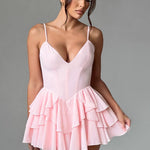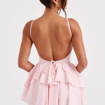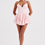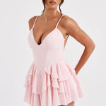 Use este lindo macacão repetidamente, feito do nosso chiffon premium que é super leve e fluido. Apresentando uma saia de babados em camadas com shorts embutidos, este design com decote profundo é costas nuas com alças ajustáveis para um ajuste perfeito. Combine com sandálias de salto quase invisíveis e uma bolsa brilhante.
