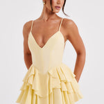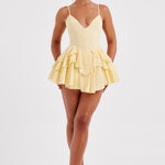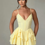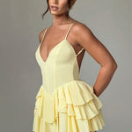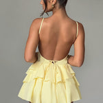 Use este lindo macacão repetidamente, feito de nosso chiffon premium que é super leve e fluido. Com uma saia de babados em camadas e shorts embutidos, este design com decote profundo é costas nuas e possui alças ajustáveis para um ajuste perfeito. Combine com sandálias de salto quase invisíveis e uma bolsa brilhante.