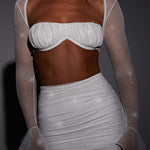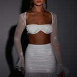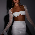 Elegante e super sexy, a Maisie com certeza será uma das suas favoritas nesta temporada. Feita de uma malha de brilho super macia com muito stretch, a Maisie é forrada para um ajuste que abraça seu corpo como uma luva. As mangas de malha transparentes se estendem e se alargam para uma sensação feminina, além de que os copos com aro realçam o busto para o mais incrível decote. Combine com a saia Maisie, ondas glamourosas e saltos azul bebê.
