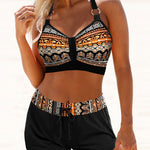O padrão geométrico acrescenta originalidade e frescura ao seu estilo, tornando o biquíni particularmente atraente.