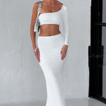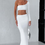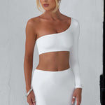 Leve o seu estilo para o próximo nível com o Nova crop top, um design assimétrico e cool com um ombro e manga longa. Feito em nosso tecido super macio e fluido que valoriza a silhueta, este design cropped fica incrível combinado com a saia maxi Astrid, cabelo liso e saltos mínimos.
