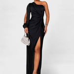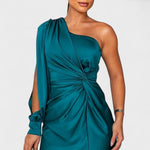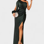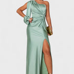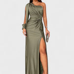 O vestido de um ombro só com drapeado é o epítome da elegância moderna. Com o seu corte assimétrico, cetim fluido e drapeados que esculpem a figura, parece uma peça de alta-costura de uma gala de moda. O look sensual com fenda nas pernas torna-o perfeito para eventos noturnos, casamentos ou jantares VIP - para qualquer pessoa que queira ser vista.