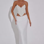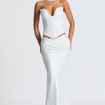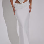 Oh, ela é luxo! Garantida para fazer você ser o centro das atenções, a saia maxi Bernadette é confeccionada em nosso luxuoso cetim stretch, cortada na diagonal para um caimento bonito. Esta peça única possui um detalhe de pregas na frente e costura diagonal no joelho. Combine-a com o corpete Sierra para um look angelical.