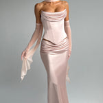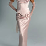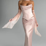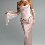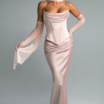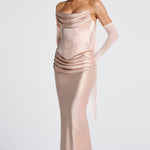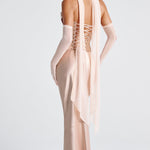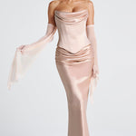 A Saia Maxi Bernadette em Pêssego Suave é a definição de romance. Confeccionada em cetim stretch sedoso e cortada na diagonal, ela cai com facilidade para um fluxo suave e feminino. Pregas delicadas na frente e uma costura diagonal no joelho adicionam um detalhe sonhador. Combine-a com o Corset Callista, Cachecol Ayla e Luvas Eli para um visual etéreo, do pé à cabeça.