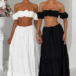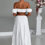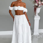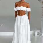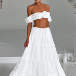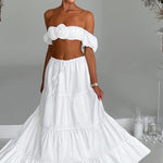 Cortada em um tecido de algodão branco misto e fresco, o conjunto Carmen é feito para brunches em dias quentes. Esta saia é de comprimento maxi e assenta elegantemente abaixo da sua cintura, nos quadris, para uma sensação relaxada e boêmia. A saia em camadas é super solta e finalizada com um detalhe de laço. Combine-a com o cropped Carmen para o look mais bonito que você usará nesta temporada.
