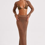 Nosso novo conjunto de crochê premium é despretensiosamente estiloso. Com um leve stretch e cintura alta, a saia maxi Riella é super ajustada ao corpo. Combine com nosso top Jia e o bolero Riella combinando.
