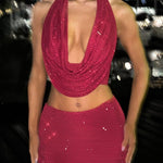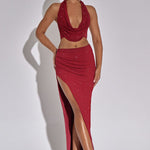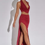 O conjunto definitivo da IT girl, você vai brilhar a noite toda com a Val. Feita de um tecido de malha elástica brilhante que se ajusta a cada curva, esta saia maxi de cintura alta vem com uma fenda super alta na coxa. Combine com o top Val.
