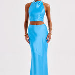 As linhas limpas da nossa saia maxi Zaylee a tornam uma peça favorita do guarda-roupa. Cortada de forma bela na diagonal, ela destaca o caimento fluido do cetim premium que desliza sobre os quadris.