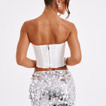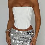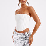A saia IT girl da temporada, brilhe a noite toda com a Anissa. Feita em nosso tecido premium de lantejoulas, esta mini fica um pouco mais baixa nos quadris e fica incrível combinada com o corset Cami.