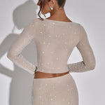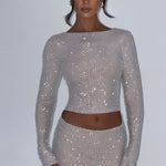 Brilhe a noite toda com o conjunto Tani. Feito de uma malha brilhante de strass que se ajusta a cada curva, este top de manga longa é cropped com um decote alto. Combine com a saia Tani, ondas lisas e saltos para a temporada de festas.