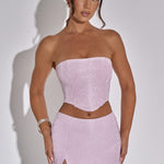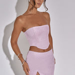 Selecionado internamente, o luxuoso top Aimee é confeccionado com nosso tecido premium brilhante. Com uma silhueta sem alças, Aimee é super ajustado para uma cintura acentuada e lisonjeira.