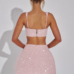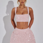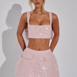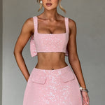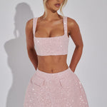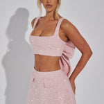 Clássico e glamouroso em medidas iguais, você vai se apaixonar pelo top bralette Kiri. Feito em nosso luxuoso tecido de tweed com lantejoulas, apresenta decote quadrado com alças ajustáveis e uma laço removível e divertido nas costas. Faça um conjunto com a saia mini Kira.