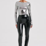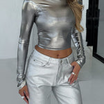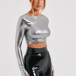 Nosso top metálico Kyranni exala glamour, feito de um luxuoso jersey semi-transparente que se molda à sua silhueta para um ajuste dos sonhos. O top possui mangas longas, um decote alto que valoriza e fica incrível usado sobre o sutiã Macy com a calça Cassidy.