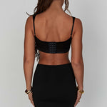 A roupa para a noite pede o top Loren, um bralet elevado cortado de nosso luxuoso tecido de cetim pesado com elasticidade. O design com decote profundo apresenta um detalhe plissado no busto. Combine com um choker metálico, cabelo ondulado e mules de salto.