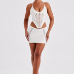 O top perfeito para a sua próxima soirée de verão, Selma é feito em nosso tricô de crochê premium com a estrutura no corpete para um ajuste justo. O design é complementado com copas em formato triangular, detalhe de ilhós na frente e um impressionante costas abertas que se amarra. Combine com a saia Selma correspondente e ondas praianas.