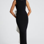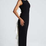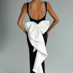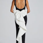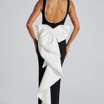 O Vestido Lana Midaxi em Preto e Branco exala elegância atemporal. Confeccionado em crepe premium sem elasticidade, este vestido apresenta um decote barco alto e largo, adornado com um delicado acabamento de pérolas que continua ao redor da borda do pescoço e das costas. A saia em forma de coluna alonga a silhueta, com uma fenda central nas costas que adiciona um toque de elegância. As costas com decote baixo aumentam seu charme. O laço oversized em destaque, adornado com pérolas, acrescenta um toque dramático às costas.