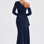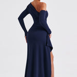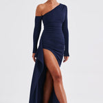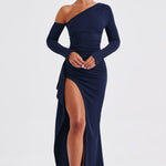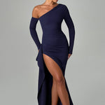 Elegante, glamouroso e atemporal são as três palavras que descrevem perfeitamente Abrielle. O vestido ideal para um encontro, este deslumbrante design é confeccionado em crepe duplo com um decote assimétrico e mangas longas. O look é completado com um detalhe de drapeado e uma fenda alta na coxa, além de pregas na cintura. Estilize o seu com cabelos românticos e ondulados e joias simples em ouro.
