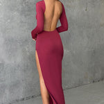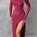 Apresentamos seu novo vestido maxi minimalista favorito, um design super chique com mangas longas, gola alta e um impressionante decote nas costas. Com uma silhueta levemente evasê na saia, este vestido proporciona um conforto macio como manteiga, com um design contornado que realmente esculpe e modela as curvas naturais.