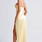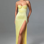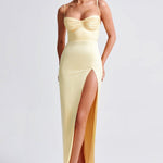 Encontre seu vestido para sempre em Alora, nossa peça mais deslumbrante feita para cada evento especial em seu calendário nesta temporada. Projetado em nosso luxuoso e pesado cetim, este estilo stretch é cortado próximo ao corpo para um visual super ajustado. O vestido é completado com copas franzidas que são estruturadas, além de uma fenda alta na coxa.
