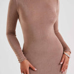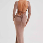 Sinta-se esculpida e sexy no vestido maxi Anastassia, seu novo vestido dos sonhos com mangas longas e um decote nas costas que chama a atenção. Feito com nosso tecido exclusivo de dupla camada, use o seu com ondas soltas e saltos plataforma.
