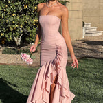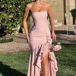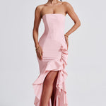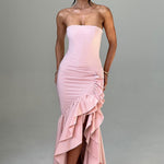 Entre na sua era de menina suave com o vestido maxi Angelina, confeccionado em nosso luxuoso tecido de algodão misto sem elasticidade que abraça o corpo para a silhueta dos sonhos. Este design sem alças é completo com uma saia volumosa e assimétrica que é super bonita e divertida.