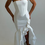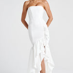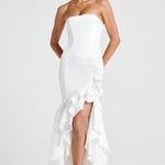 Abraçe a elegância atemporal com o Vestido Maxi Angelina em marfim. Este deslumbrante vestido maxi sem alças apresenta um corpete interno com estrutura, oferecendo um caimento escultural e que valoriza a silhueta. As costuras contornadas realçam sua figura, enquanto as volumosas babados na barra criam um acabamento marcante e feminino. Combine com saltos finos e joias delicadas para um look chique e sem esforço que exala glamour refinado.