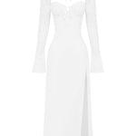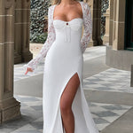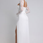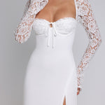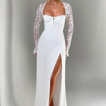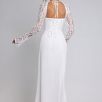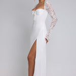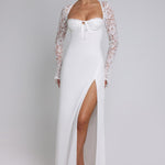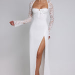 Sinta-se angelical com Aria, um vestido maxi fluido feito de chiffon premium e forrado com tecido de cetim que se ajusta ao corpo para oferecer a silhueta dos sonhos. O design é complementado com mangas de renda transparentes e sem forro, acabamento em picô e busto com aro. Um fechamento nas costas com painel franzido proporciona um ajuste perfeito. Mantenha o visual chique com um cabelo solto e despojado preso e saltos brancos.