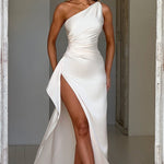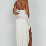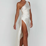 Sinta-se como a deusa que você é no Ariel, nosso vestido premium feito de um cetim leve e luxuoso com elasticidade para abraçar suas curvas. Com detalhes drapeados e design de um ombro, o vestido maxi arrasta no chão e é completo com uma fenda alta na coxa. Estilize o seu com cabelo liso, uma bolsa pequena e mules de salto.