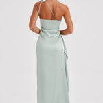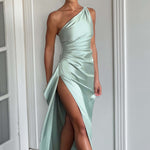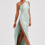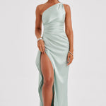 Sinta-se como a deusa que você é com Ariel, nosso vestido premium feito de cetim leve e luxuoso com elasticidade para abraçar suas curvas. Com detalhes drapeados e design de um ombro, o vestido maxi arrasta no chão e é complementado com uma fenda alta na coxa. Estilize o seu com cabelo liso, uma mini bolsa e mules de salto.