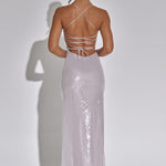 A temporada de festas chegou, então aproveite ao máximo com o deslumbrante vestido Bells. Este maxi que arrasta no chão é feito de nosso tecido brilhante com corte enviesado, que tem um caimento lindo e se ajusta à sua silhueta. O vestido é completamente sem costas, com alças detalhadas para amarrar.