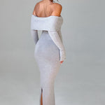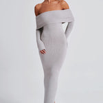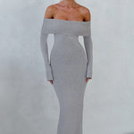 Tricôs leves são A menina. Nós adoramos nosso lindo e suave vestido maxi Beverley, feito em tricô premium que se ajusta ao seu corpo como uma luva. Com um estilo off the shoulder e um painel largo de bardot, mangas longas e ajustadas que se alargam na barra e uma pequena fenda na parte de trás da saia, combine o seu com ondas soltas e descontraídas e joias em ouro.
