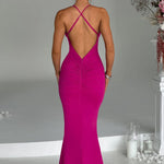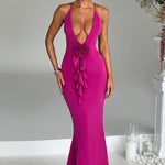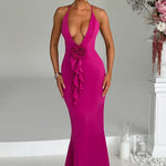 Certifique-se de que todos os olhares estão em você com o vestido maxi Constantina. Este vestido ousado e elegante está no topo das nossas listas de desejos para a temporada de festas, feito com nossa malha dupla elástica que se ajusta como uma luva. Este design com decote profundo é completado com alças de halter e uma corsage com babados no centro.
