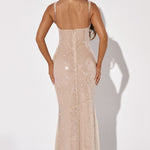 Esteja pronta para o RSVP com o vestido Corinne, um design de comprimento maxi feito em tecido premium com paetês por toda parte, forrado em cetim suave. Um verdadeiro showstopper, este vestido apresenta um decote quadrado, costas em formato de scoop de altura média e costura sob o busto para um caimento lisonjeiro. É cortado na diagonal, o que proporciona um belo caimento, e é finalizado com uma costura assimétrica na saia. Estilize com ondas glamourosas, maquiagem radiante e mules de salto discretos.
