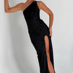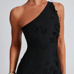 Conheça Cynthia... prometemos que você não está sonhando! Este vestido único é a perfeição do estilo "soft girl", feito em uma malha delicada com apliques de flores 3D brincalhonas espalhadas pelo corpo. Com um decote assimétrico de um ombro, alças ajustáveis nas costas e uma fenda alta na coxa, este vestido se molda aos contornos do seu corpo para um ajuste como uma segunda pele, abrindo suavemente na saia.