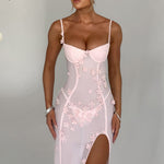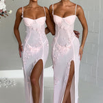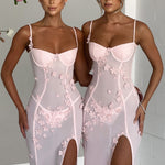Conheça Dalary... prometemos que você não está sonhando! Este vestido único é a perfeição do estilo soft girl, feito em uma delicada malha transparente com apliques de flores brincalhonas espalhados pelo corpo. Com um busto moldado para realçar seu peito e uma fenda alta na coxa, este vestido se ajusta aos contornos do seu corpo para um caimento como uma segunda pele.