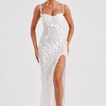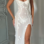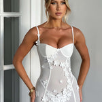 Conheça Dalary... prometemos que você não está sonhando! Este vestido único é a perfeição do estilo suave, feito em uma delicada malha transparente com apliques de flores divertidos, costurados à mão individualmente, espalhados pelo corpo. Com um busto moldado para emoldurar seu peito e uma fenda alta na coxa, este vestido se adapta aos contornos do seu corpo para um ajuste de segunda pele.