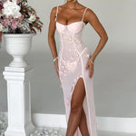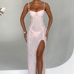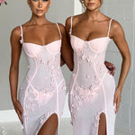 Conheça a Dalary... prometemos que você não está sonhando! Este vestido único é a perfeição do estilo "soft girl", feito em uma delicada malha transparente com apliques de flores brincalhonas espalhados pelo corpo. Com um busto moldado para emoldurar seu peito e uma fenda alta na coxa, este vestido se adapta aos contornos do seu corpo para um ajuste como uma segunda pele.