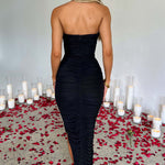 O clássico vestido Demi preto é feito para jantares glamourosos e coquetéis com as amigas. Cortado do nosso tecido de malha power super macio, que é forrado em jersey duplo, o Demi modela o corpo de dentro para fora e age como uma roupa shapewear. Adoramos o busto estruturado sem alças que proporciona um decote incrível, além da fenda lateral para exibir as pernas. Use o seu com um nó elegante, joias mínimas e os seus saltos mais altos.