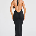 Todos os olhares sobre você! Diga sim a todas as festas, eventos e ocasiões nesta temporada com o vestido maxi Evangeline, um design sexy e ajustado feito em jersey premium para valorizar suas curvas. Este vestido com decote profundo possui alças halter que se amarram nas costas, detalhes plissados no busto e na cintura e um impressionante decote em V nas costas com detalhes franzidos na parte de trás. Use com o cabelo bagunçado e joias mínimas.