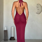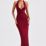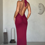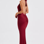 Harmonia é o vestido dos sonhos para festas, casamentos, eventos formais e muito mais. Feito com nosso tecido jersey elástico que é super lisonjeiro, abraçando o corpo com uma sensação de segunda pele, este maxi tem um decote halter profundo, amarração na nuca e costas em V baixo com franzido na parte de trás. Use com um penteado suave e texturizado, acessórios metálicos e saltos plataforma.