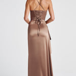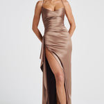 O Vestido Maxi Helen na cor Hazel é uma peça marcante e sofisticada que combina cetim stretch luxuoso com detalhes de design impressionantes. O decote cowl torcido oferece um efeito drapeado lisonjeiro, enquanto as alças cruzadas ajustáveis e as costas com amarração permitem um ajuste personalizado. Pregas assimétricas no corpete criam um visual dinâmico e esculpido, enquanto a fenda drapeada na coxa adiciona um toque ousado de charme e movimento.