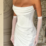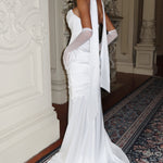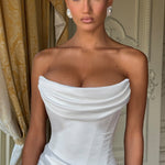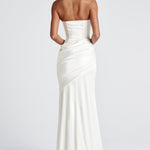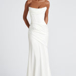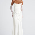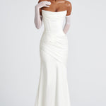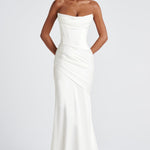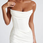 O Vestido Maxi Kensington em Marfim é deslumbrante. Feito de luxuoso cetim stretch, este vestido sem alças apresenta um corpete estruturado com aros, um decote em cowl arredondado e um painel drapeado plissado que flui para uma saia em forma de sereia que valoriza a silhueta. A linda cauda pode ser presa para versatilidade, enquanto as costas com amarração garantem um ajuste perfeito. Este vestido é uma escolha inesquecível para qualquer ocasião especial.