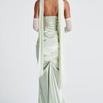 Roube a cena com o Vestido Maxi Kensington em Menta, uma deslumbrante roupa formal confeccionada em seda stretch elegante. Projetado com um corpete estruturado e com apliques, decote strapless em formato arredondado e um elegante drapeado, ele se ajusta perfeitamente com um fechamento nas costas. A cauda fluida com um arranjo adiciona um acabamento dramático. Complete o look com o Lenço Sybil e Luvas Eli em Menta para um conjunto digno de tapete vermelho.